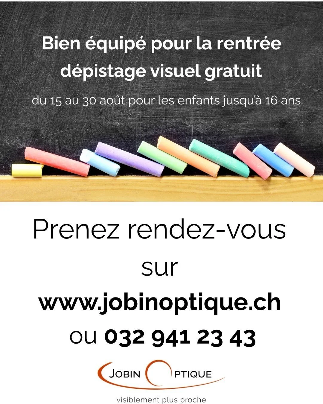 Établi depuis 1934 à Saint-Imier, Jobin Optique est l’opticien de votre quotidien. Petits et grands y bénéficient de la même attention. L’équipe vous offre des conseils adaptés à vos besoins, en matière de montures, de verres ophtalmiques, de lentilles de contact, d’examen de la vue ainsi que d’assurances et de garanties. Ceci pour tous les budgets. Parce que les yeux, c’est aussi une question d’écoute !